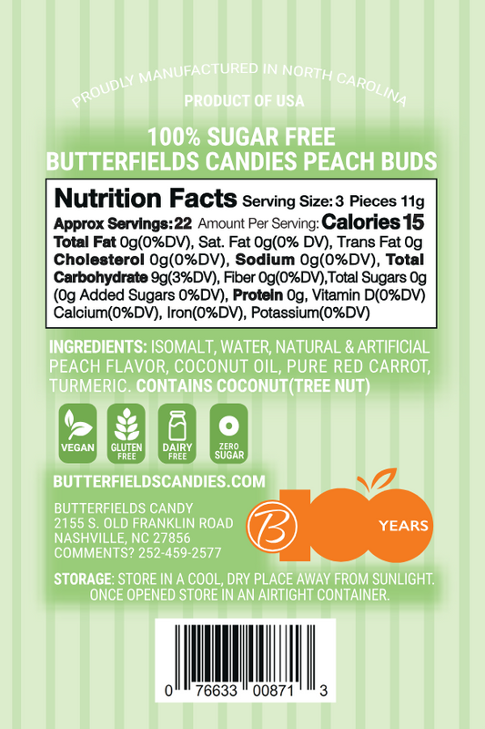 These exquisite peach hard candies embody the essence of Butterfields' signature offering. Renowned for their natural peach flavor, they are a testament to our longstanding motto: "It all started with a peach!"