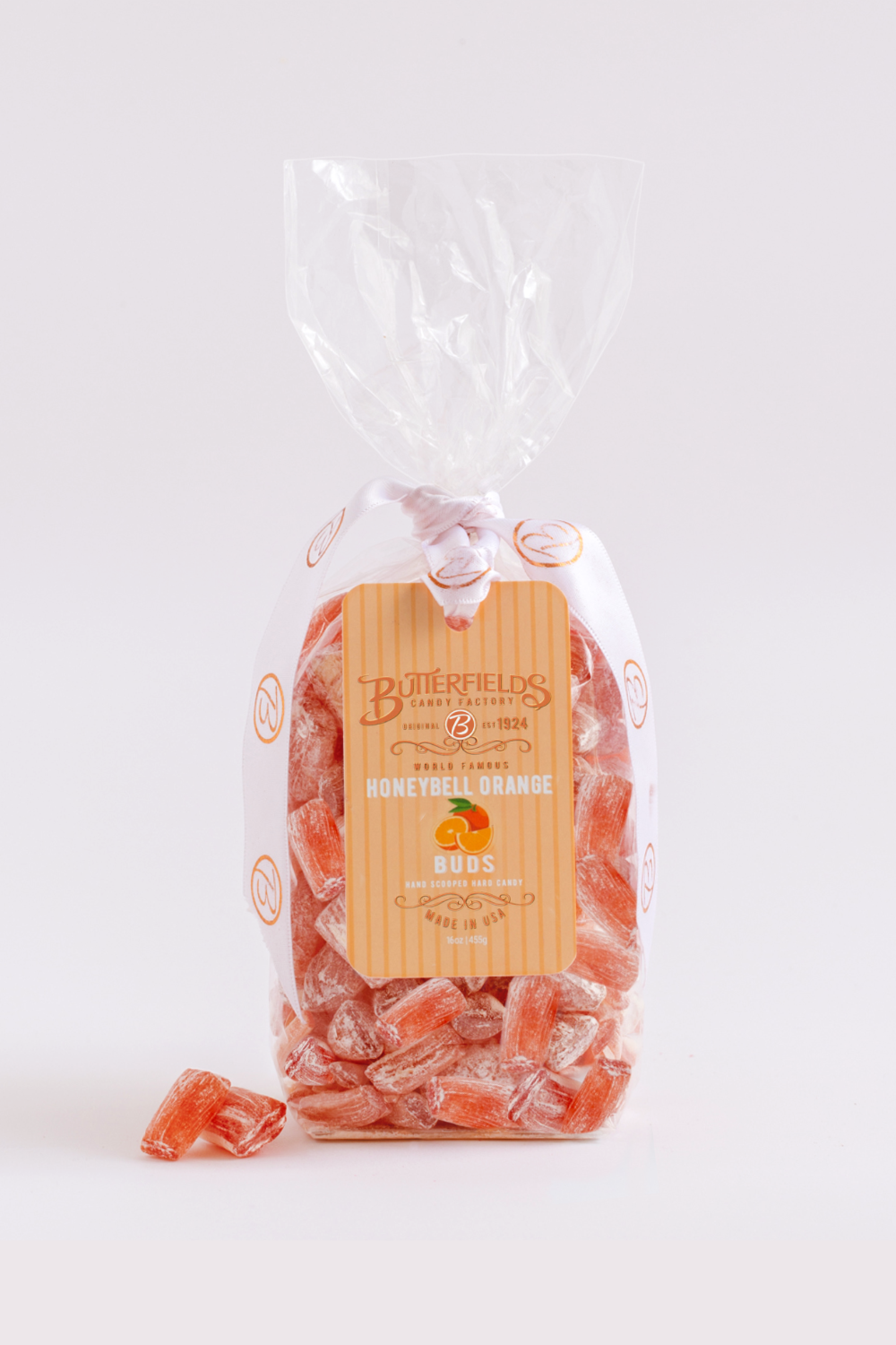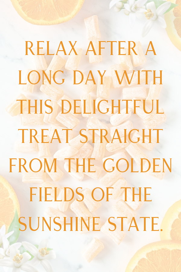 Relax after a long day with our honeybell orange hard candies. This delightful treat has a taste straight from the Indian River of the Sunshine State, Florida